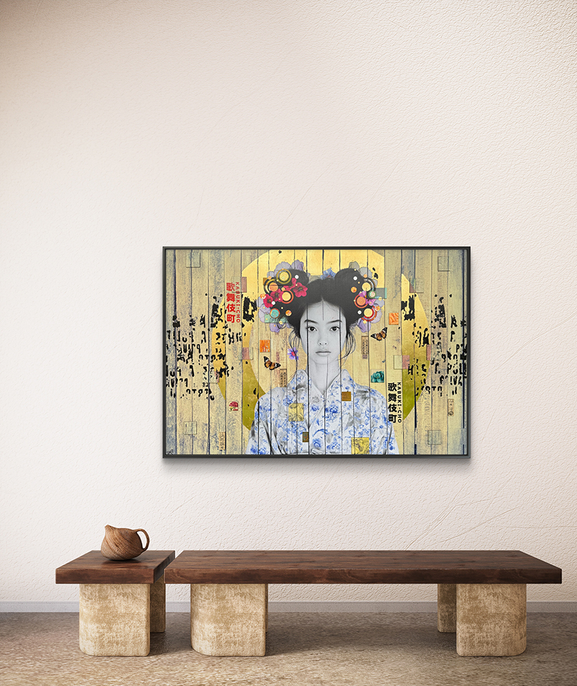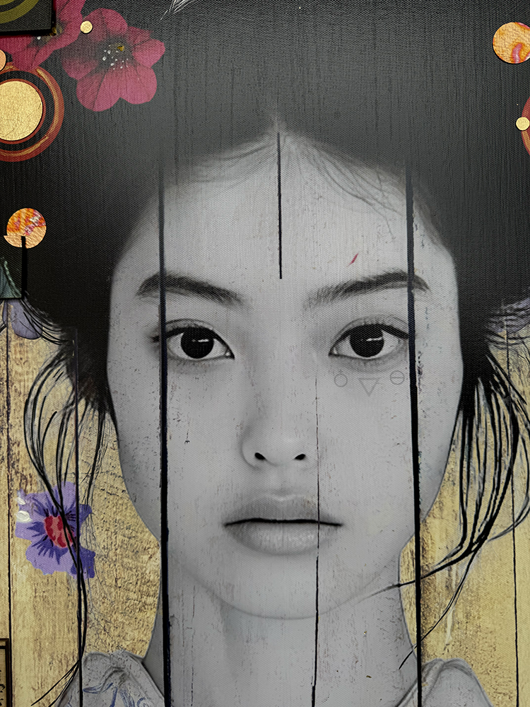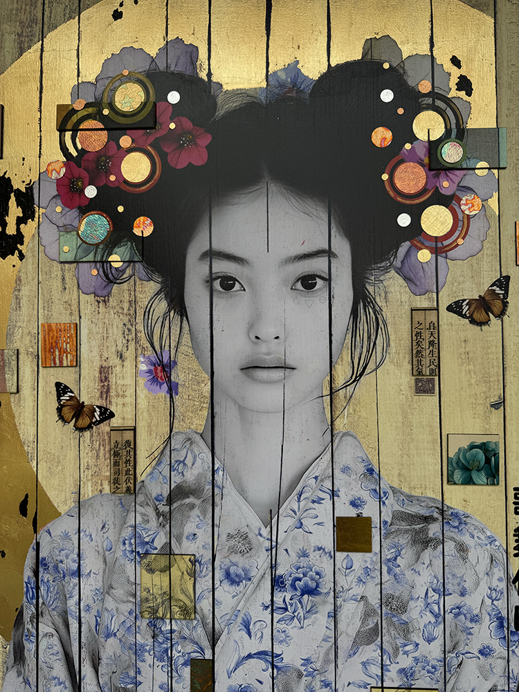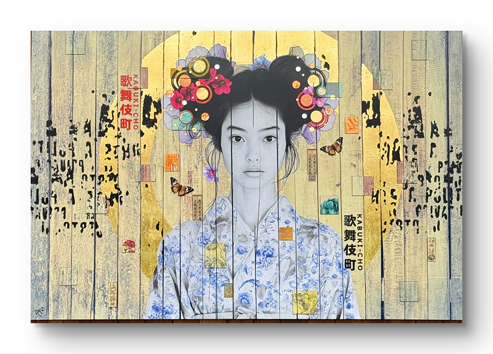 140 x 94 cm approximately. Limited Edition giclée printed canvas combining digital and traditional design with hand applied techniques in the application of acrylics, Gold Leaf ‘halo’, Gold, Variegated Silver and Copper Leaf discs, Japanese woodblock text, 3D relief tiles and authentic world postage stamps.
