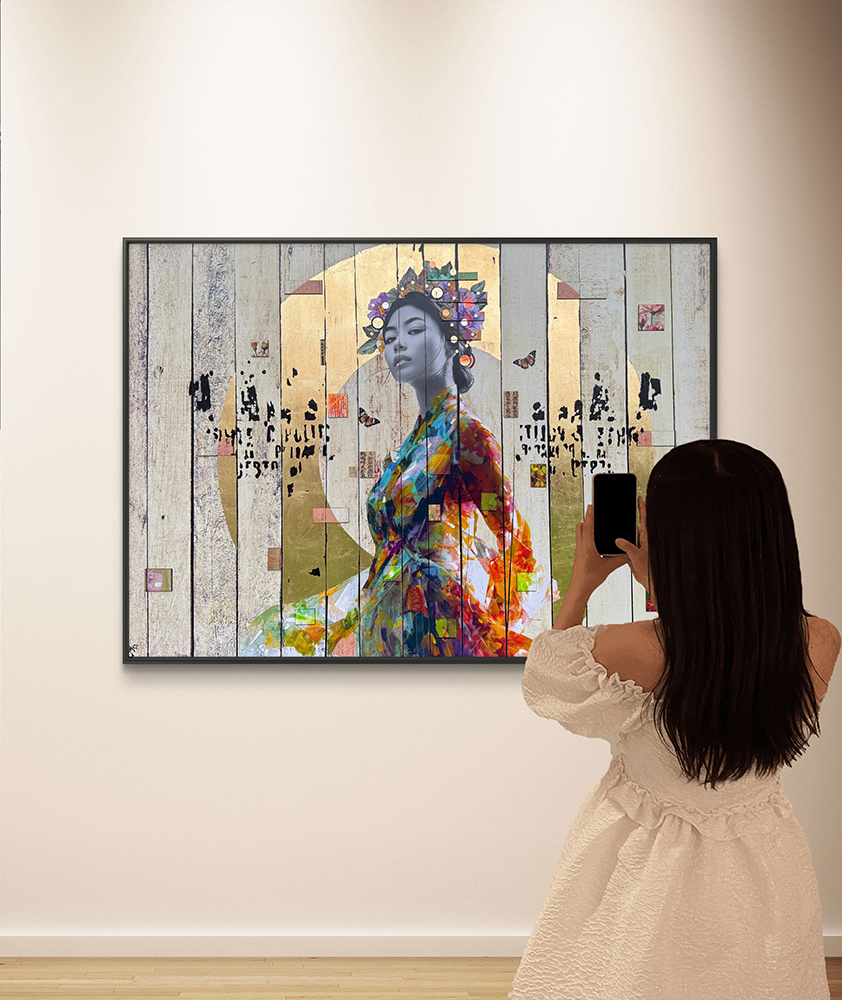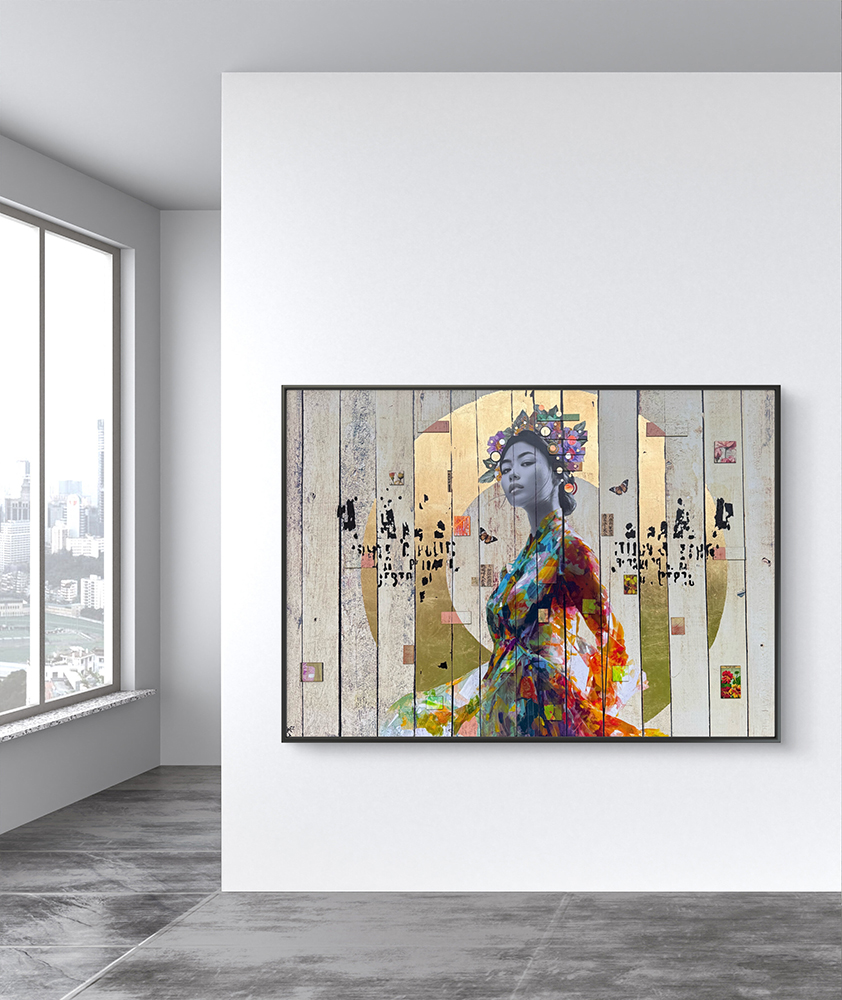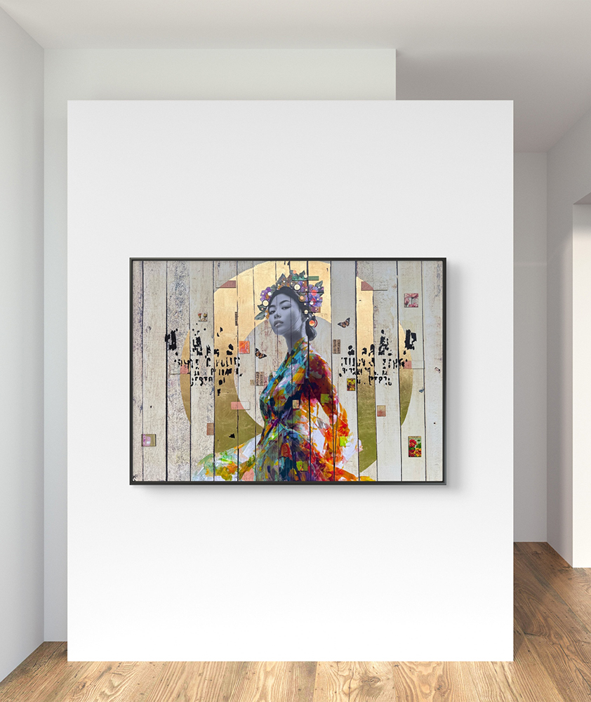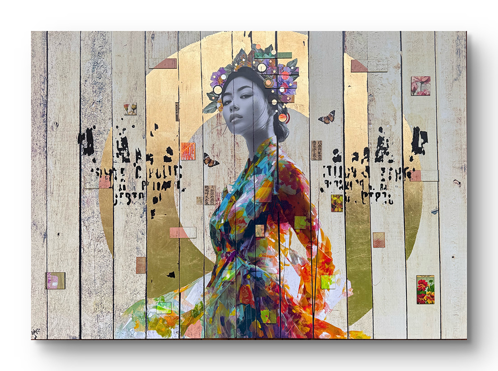 140 x 94 cm approximately. Limited Edition giclée printed canvas combining digital and traditional design with hand applied techniques in the application of acrylics, Gold Leaf ‘halo’, Gold, Variegated Silver and Copper Leaf discs, Japanese woodblock text, 3D relief tiles and authentic world postage stamps.